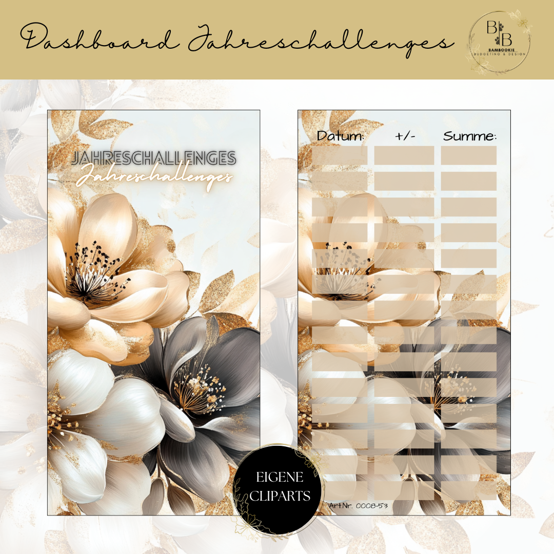 Unsere hochwertigen laminierten Dashboards mit tollen Motiven sind die perfekte Ergänzung für deinen Binder. Sie helfen dir, den Überblick über deine Sparziele und deine bereits abgeschlossenen Sparchallenges zu behalten.