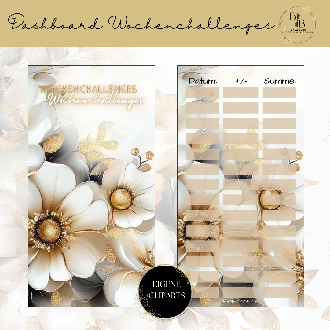 Unsere hochwertigen laminierten Dashboards mit tollen Motiven sind die perfekte Ergänzung für deinen Binder. Sie helfen dir, den Überblick über deine Sparziele und deine bereits abgeschlossenen Sparchallenges zu behalten.
